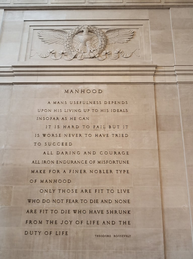 As we spoke, I took in the spectacular interior of the museum’s entrance, a Roman-inspired memorial to Teddy Roosevelt rendered in pink granite. Directly above us, a mural depicting the construction of the Panama Canal in gorgeously allegorical terms held my attention, until my eyes wandered to a massive engraved quote above the ticket desk on an adjacent wall. “MANHOOD,” read its massive heading. I braced for the inevitable cringe.