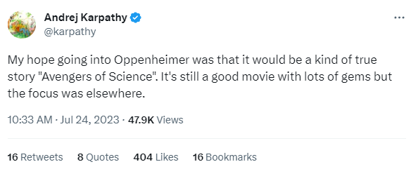 Even setting aside the sheer cultural desolation of the suggestion that a Chris Nolan-directed period piece about one of the most ethically-charged scientific inventions in history should have been more like a comic book movie, there’s a lot to unpack here. Like Altman and Musk, Karpathy sees the figure of Oppenheimer (and presumably anyone who contributed to the invention of the bomb), as comic book-level superheroes whose pure scientific achievement makes them worthy of adulation. For them, the moral and ethical ambiguity that forms the very heart of Oppenheimer’s story is a distraction instead of the entire point.