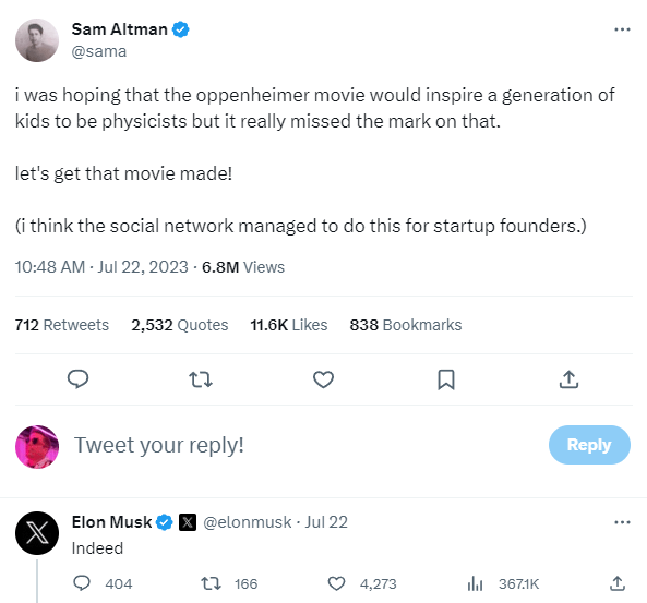 LOL, yeah right. Posting just days before announcing WorldCoin, a breathtakingly hubristic project to collect the biometric data of every human being alive in exchange for cryptocurrency, Sam Altman of OpenAI reveals that he thought Oppenheimer was going to be a movie that “would inspire a generation of kids to be physicists!” Who could have guessed that the story of the creation of the atomic bomb might be more ethically nuanced than your typical Hollywood feel-good, inspirational romp? Not the guy going around telling everyone that the AI he is creating carries very real risks of human extinction!