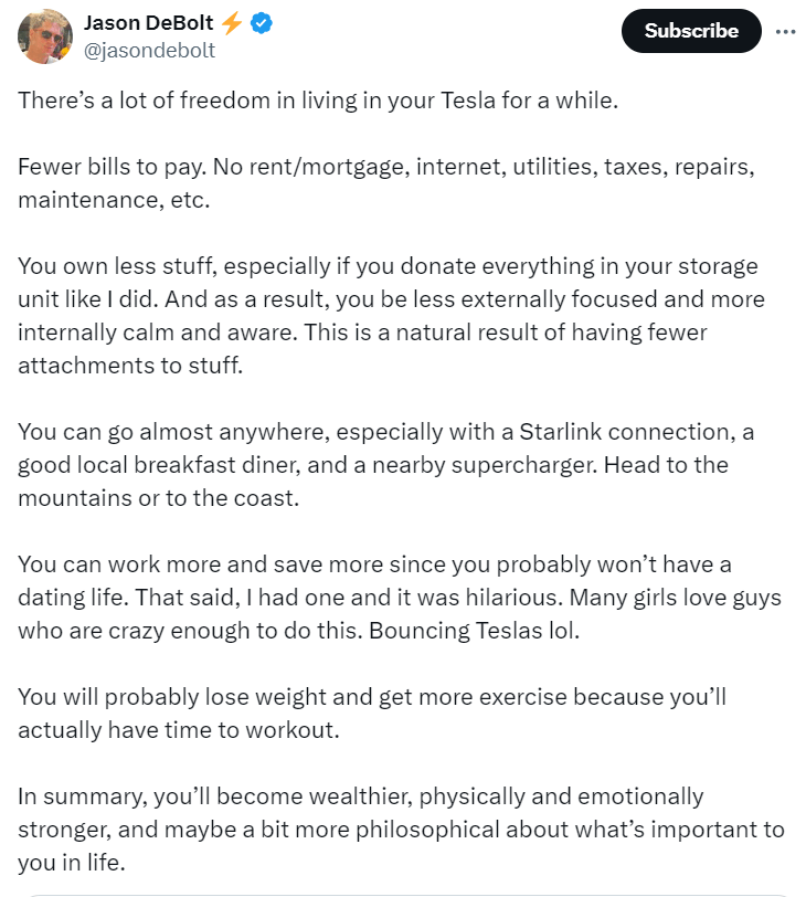 With Black and his fellow Adult Tesla Investors fleeing the sinking ship, Tesla’s base of support is regressing to the degenerate gambler mean set by Musk’s long example. Cultists like Jason DeBolt, who countered Black’s capitulation with a heartfelt paean to the joys of Tesla-based homelessness, are once again the face of this company’s investor base. Once you’ve convinced people to pay five figures so their car will someday work for them as a robotaxi, strung them along for the better part of a decade, and then announced that you’re actually building a dedicated robotaxi model after all, these are the kinds of folks you are left with. Only those with the immense sense of destiny unique to the gambler on a hot streak can keep up with Musk, as he embarks on the last chapter of his world-historical ego trip.