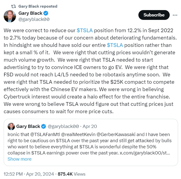 It is here, in Tesla’s investor base, where Musk’s commitment to gambling over building a real business creates the risk of an almost unthinkable unwinding of the company’s very real accomplishments. As the market-expanding Model 3 and Y hit their stride Tesla began printing real profits, particularly during the COVID undersupply, the core cultist fanbase was increasingly augmented by more serious (please be mindful of how low this bar was) investors. For years now, seasoned Wall Street managers like Gary Black (ex Harvard, Goldman, Janus, etc) have helped derisk Tesla stock by taking focus off the hilariously absurd self-driving and humanoid robot gambles, and reframing Tesla’s valuation as being primarily about the only slightly less absurd prospect of endless growth and profits from its core car business.